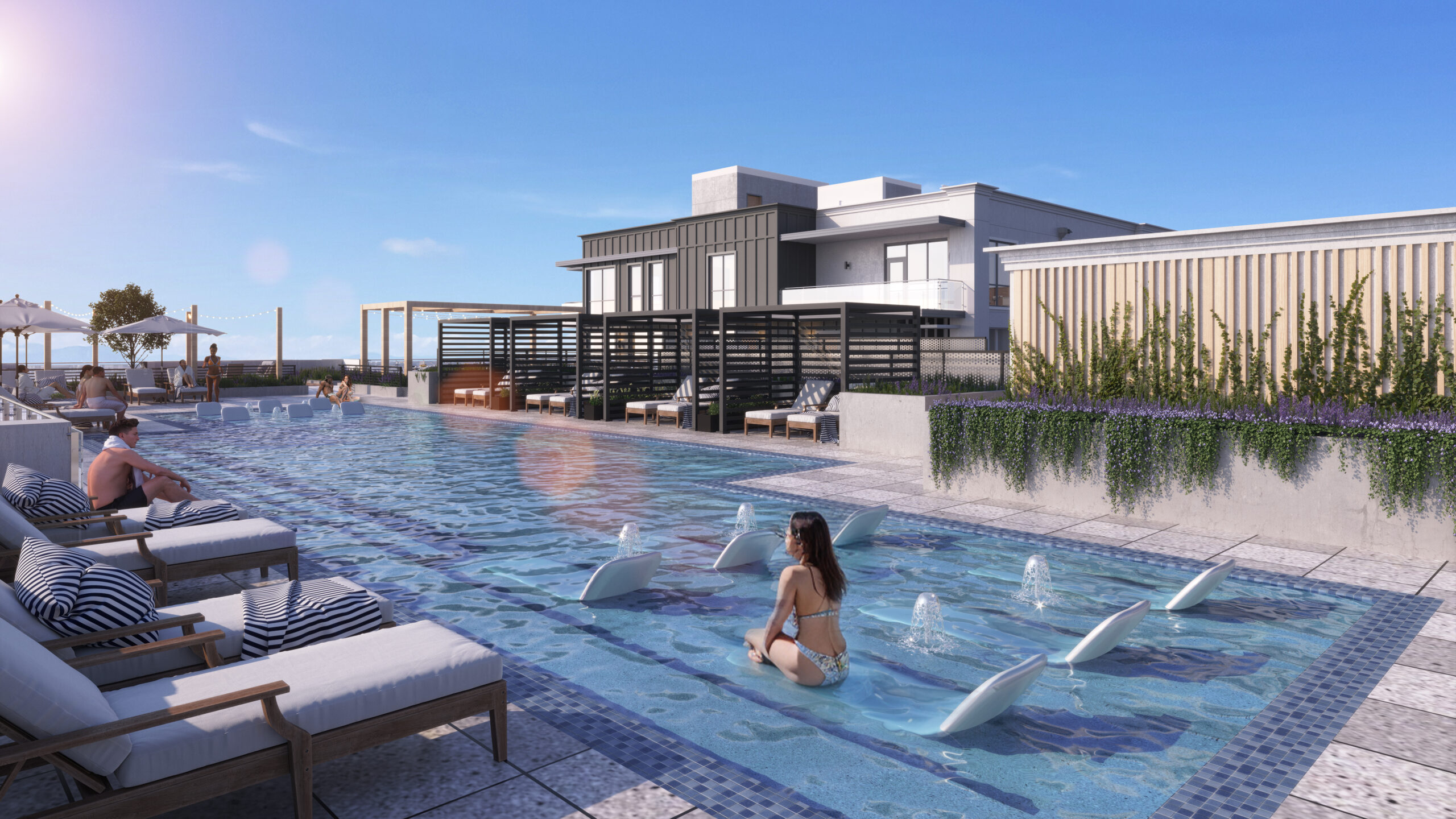 Residents enjoy exclusive access to thoughtfully designed amenities, including a rooftop resort-style pool with sun shelves and cabanas, private meeting rooms and offices, a fully equipped fitness center with guided virtual workouts, and a dog run for four-legged companions.